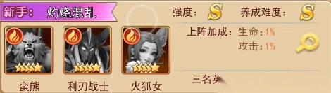 组合说明:利刃战士与蛮熊叠加灼烧输出伤害,火狐女辅助提高灼烧威力,攻击与控制兼备。