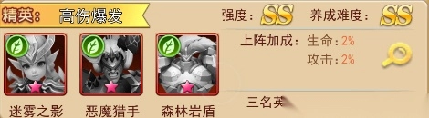 组合说明:这是绿森阵营极为强力的搭配,具备超强的进攻性!恶魔猎手与迷雾之影都值得重点培养,恶魔猎手输出稳定,而迷雾之影的爆发性更为突出。