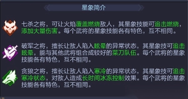 星象技能:特定效果会触发此类技能。例如七杀武将为敌方添加了燃烧状态后,会触发某些其他七杀武将技能效果。