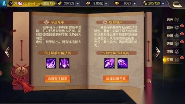 武将达到74级且进阶至4阶开启,每个兵种都有两个专精方向,专精可以互相切换,每日可免费切换一次。