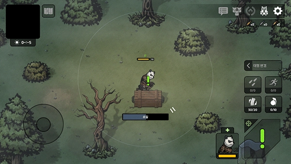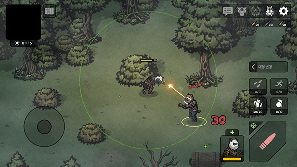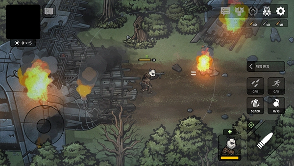 1、下载后打开进入到游戏内后,通过左边轮盘控制移动方向,右边控制射击、拾取等操作