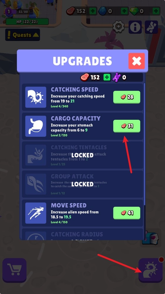 4、点击右下角还可以对自己的各项能力进行升级,如吞食速度、移动速度、胃容量等。