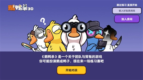 3、然后点击开始对战,鹅鸭杀3D最新版,是一个关于团队与背叛的游戏你可能扮演鹅或鸭子,现在来一场练习赛吧;