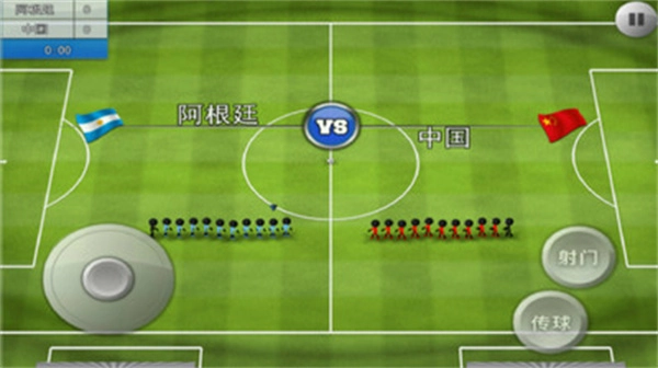 3、游戏左上角分别设置了比分牌和游戏时间显示区域。左下角配备一个摇杆式方向控制键。右下角在玩家操控时,分别对应射门与传球功能按键。