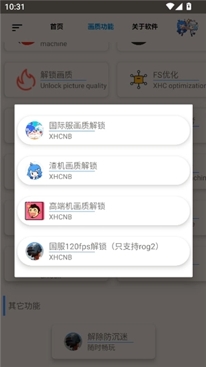 3、举例来说,若选择“解锁画质”,该选项支持渣机画质解锁、国服/国际服画质解锁等功能。