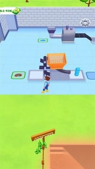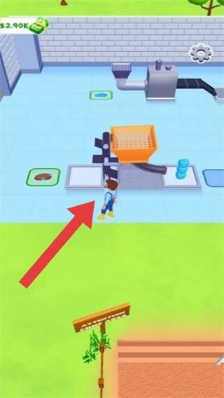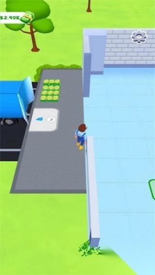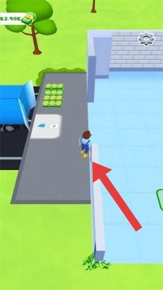 1. 场景:涵盖角色、建筑、卡车、金币堆等元素。角色所处位置类似工厂或仓库区域,画面中有$2.90K等资源显示,玩法属于模拟经营或跑酷建造类型。