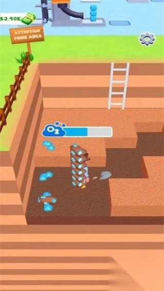 3、场景包含挖掘坑、梯子、氧气条以及恐龙化石,同时还有“$2.90K”的资源显示。玩法以挖掘恐龙化石为核心,属于模拟考古挖掘类的休闲游戏。