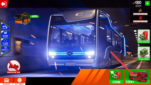 2、在游戏主界面,点击右下角【START】按钮,驾驶巴士开启游戏体验,可先查看左侧Gift等福利。