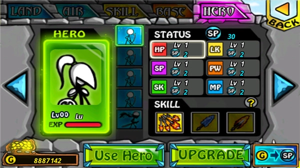 在游戏里,不光士兵能够升级,英雄同样能够升级。在游戏开启之前,我们点击英雄头像,选中英雄选项,接着就能依据自身需求对英雄的各项属性进行升级。在此小编要提醒大家,升级英雄不花费金钱,不过会消耗SP值,因此在选择升级属性时,一定要慎重考虑,挑选出对自己最具用处的属性。