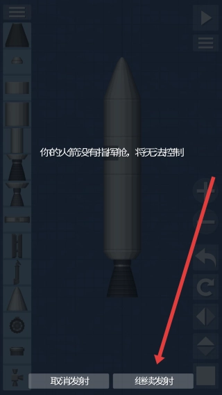 3、当出现“没有控制舱无法控制”的提示时,若你想要尝试,可点击【继续发射】;若认为需要完善设计,则选择【取消发射】,返回进行修改。