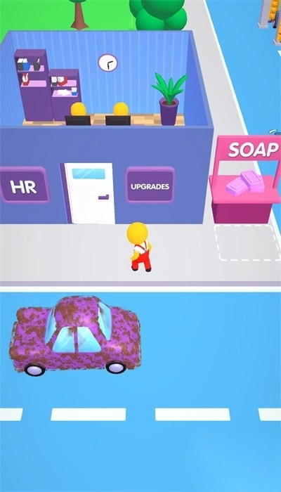 2. 展现与洗车环节相关的场景,场景中有车辆、角色,同时存在“HR”“UPGRADES”“SOAP”等功能区域标识,玩家能够在此处进行洗车等加油站经营方面的操作。