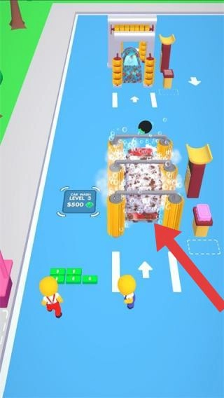 3、展现车辆洗车流程的场景,场景中包含洗车设备、角色,以及 “BUYUPGRADE$500”(花费500元购买升级)这样的经营元素。玩家能够在该场景里开展洗车、设施升级等加油站经营相关操作。