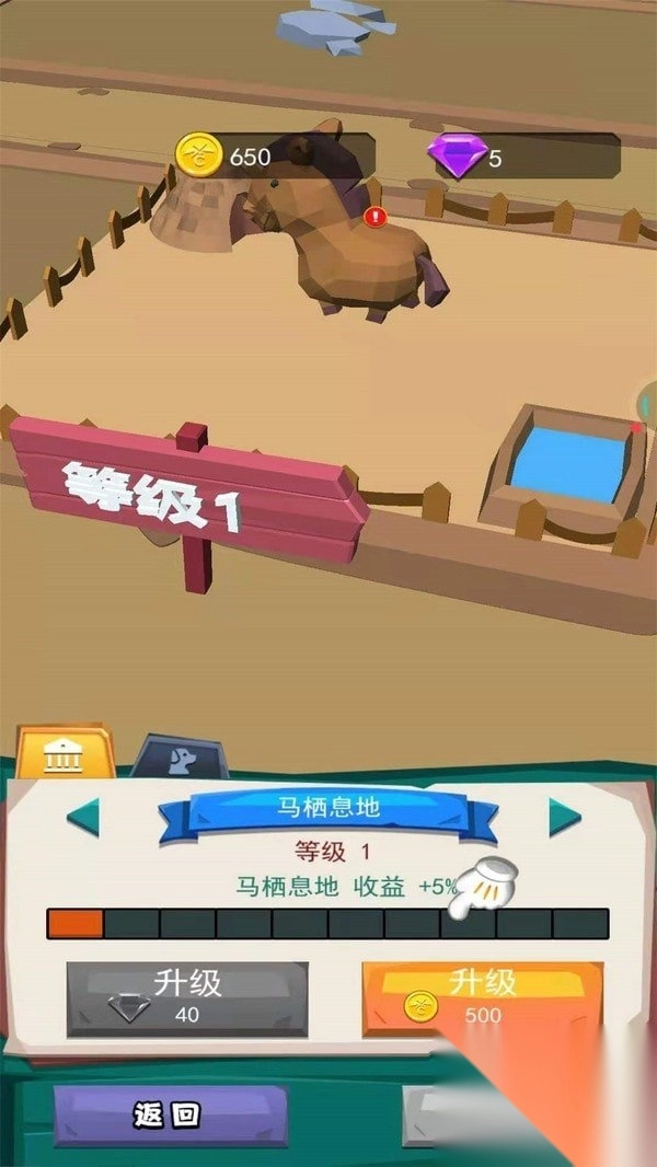 1、点击“开门营业”接待观光团,进入动物园经营界面,升级动物栖息地(如马栖息地,消耗金币提升收益)。