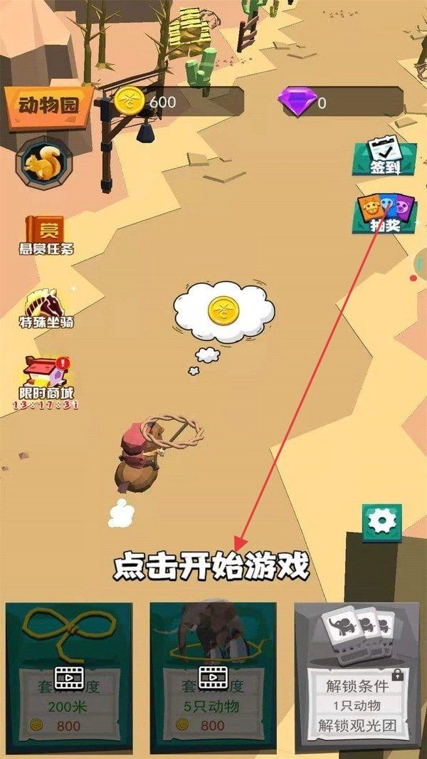 2、返回主场景,点“点击开始游戏”,操控角色骑乘动物(如马、大象),在地图探索、完成任务(套动物、解锁观光团等)。