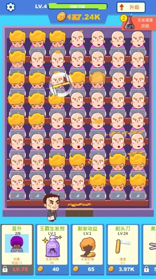 1这款游戏属于放置类,我亲自玩了半小时就通关了。主要升级增加剃头收入,稍微调整不当平衡就会被打破,通关速度相当快。