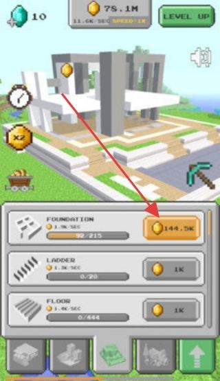 1. 在建筑界面中,点击【FOUNDATION】旁边标着“144.2K”的金色按钮,通过消耗金币来升级地基,扩大建筑基础的规模,为后续的建造工作做好铺垫。