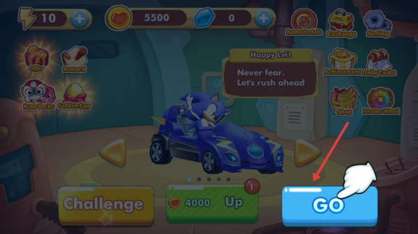 1、车库点【GO】,选索尼克赛车,进入“Race1”赛事准备。