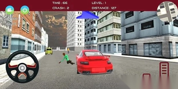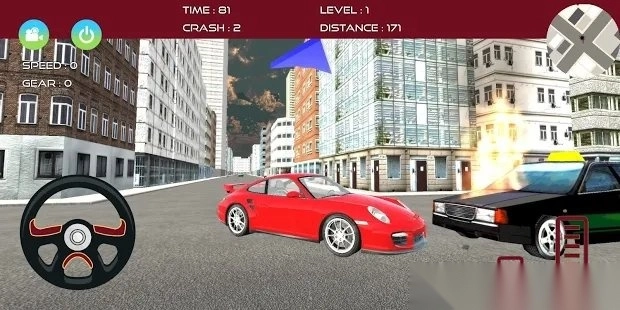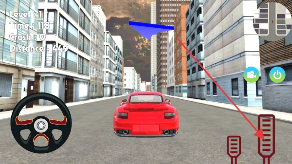 3、继续驾驶红色车辆,按照箭头所指方向朝目标停车区域行驶,同时留意剩余时间、碰撞次数以及行驶距离,精确控制方向盘与踏板。