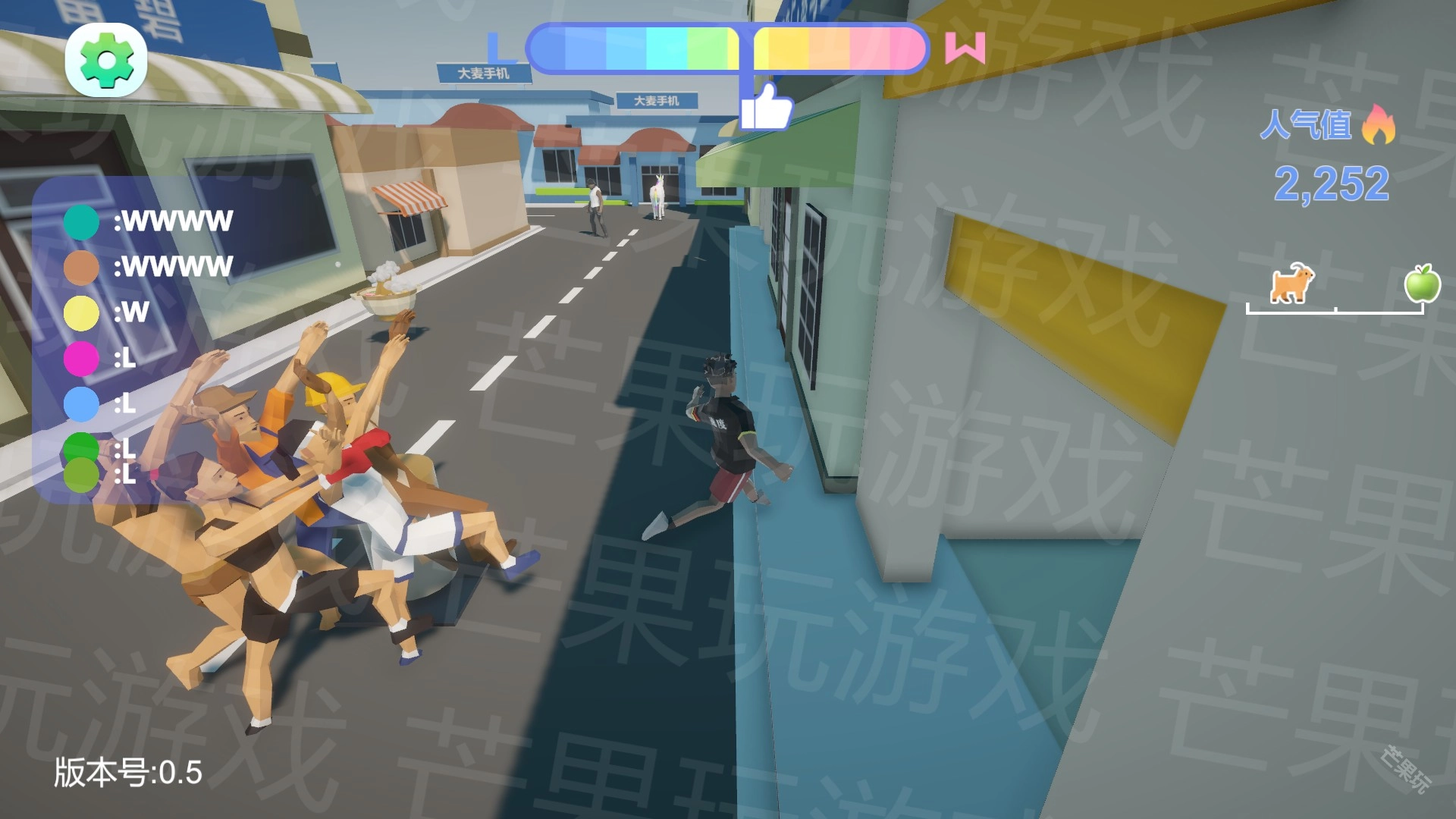 2. 游戏玩法整体属于轻松搞笑风格的跑酷类型,画面左侧会持续滚动弹幕,右侧展示当前的人气值。