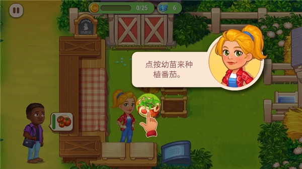 5、只需点击顾客的气泡框,就能把物品交给顾客。此后持续进行种植并交易,当成功赚到25个金币时,就能顺利通过第一关卡。