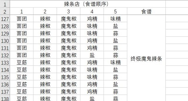 一、食谱顺序(适合想补全配方的大佬们),以下是中级魔鬼辣条的完整食谱顺序。