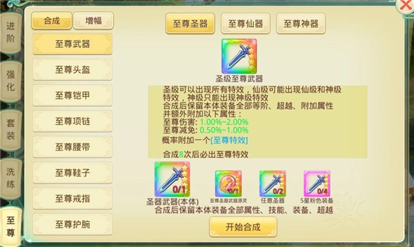 8、在至尊装备处,玩家能够进行至尊装备的合成。至尊装备具备额外的伤害加成与伤害减免属性,当这些至尊装备组成套装时,还会解锁全新的被动效果,实力相当强劲。