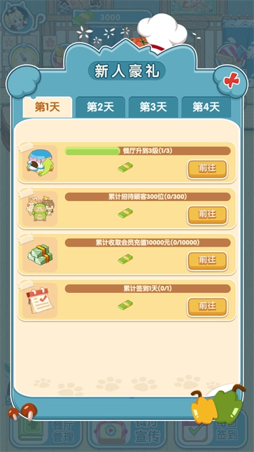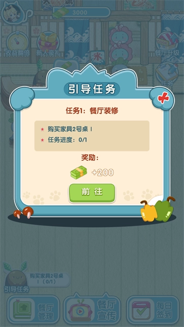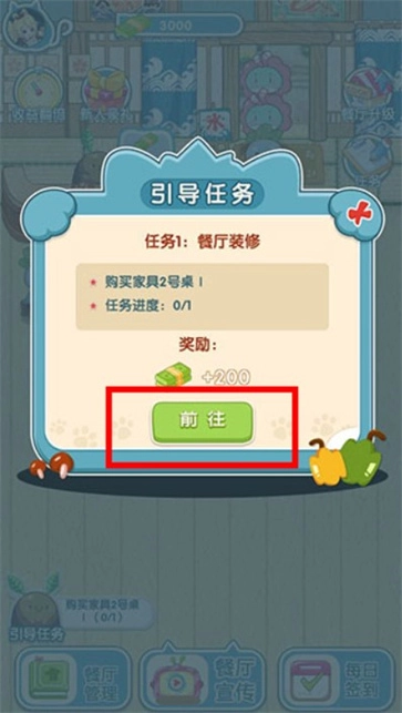 1. 为达成目标任务,提升餐厅品质、扩大餐厅面积,治愈系经营之旅此刻开启。