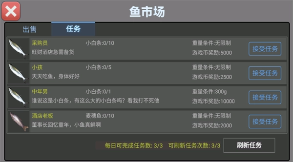 玩家也能够点击进入鱼市场。其中,采购员需求为:小白条,0/10,旺财酒店急需备货,重量条件无限制,游戏币奖励5000;小孩需求:小白条,0/5,口号是天天吃鱼,身体好好,重量条件无限制,游戏币奖励2500;中年男需求:小白条,0/1,还称“谁说这是小白条,有这么大的小白条吗?看我打不死他”,重量条件300g,游戏币奖励10000;酒店老板需求:麦穗鱼,0/10,理由是董事长回忆童年,觉得小鱼真鲜,重量条件无限制,游戏币奖励2000 。玩家可选择相应任务去完成。