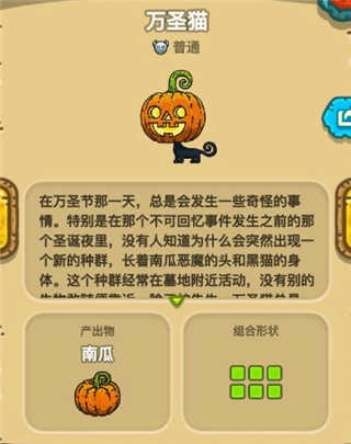万圣猫形态独特,有着南瓜恶魔般的头部以及黑猫的身躯,常出没于墓地周边。其产出为南瓜。
