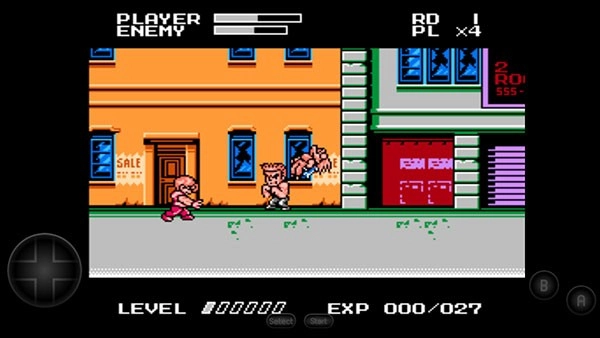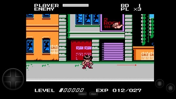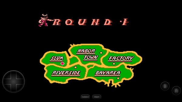 4、踏入街区后,屏幕左边用于控制角色移动,右边分别设置了拳击和脚踢的操作按钮,屏幕中间位置设有大招按钮。
