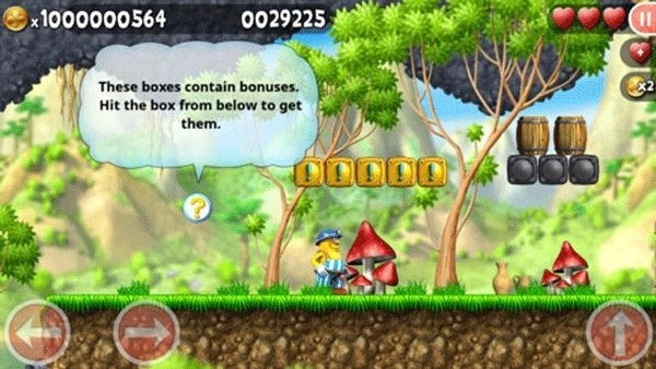 1. 左侧的两个按键,分别用于操控前进与后退,右侧按键负责控制跳跃,连续按两下即为二段跳。杰克初始拥有3颗爱心,一旦碰到诸如虫子之类的怪物,就会消耗爱心。