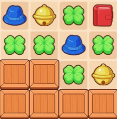 2、进行棋子交换,把颜色对应的棋子交换至同一排或同一列,让相同的棋子完成配对,以此消除木箱。