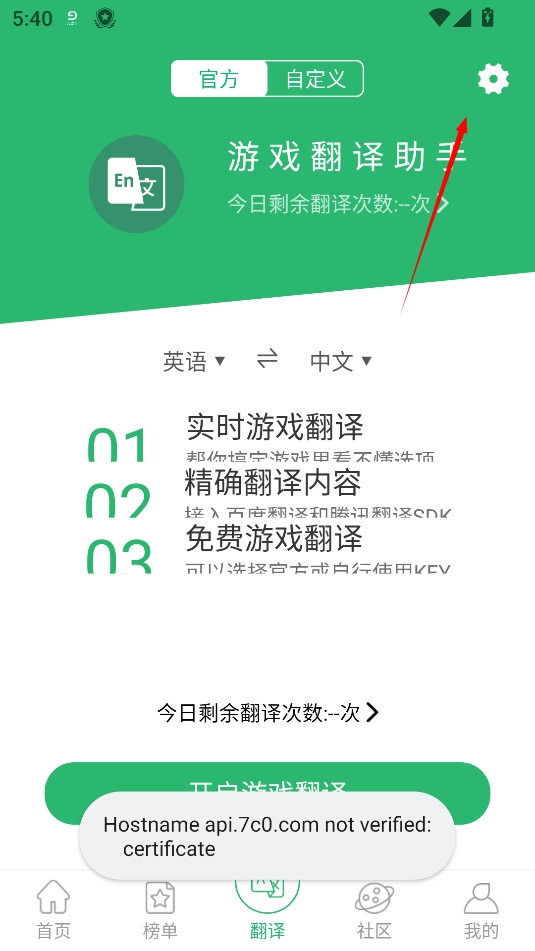 1. 当我们进入软件的翻译界面后,点击界面上方的齿轮图标。