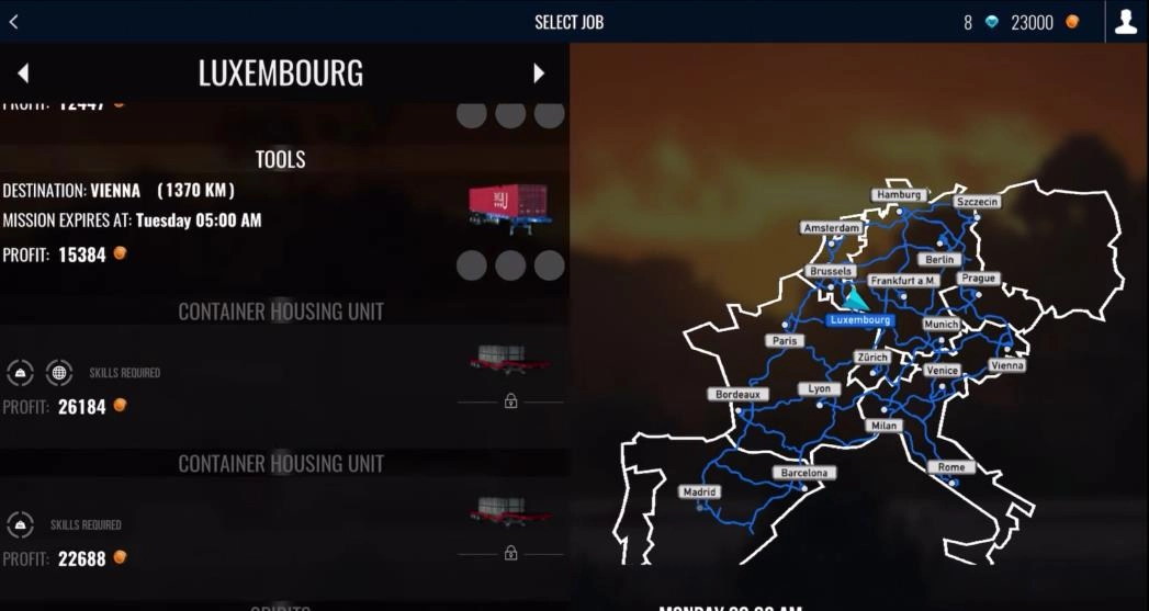 3. 拥有动态的天气变化与多样的地形,使驾驶过程更具挑战性与真实感。1. 挑选合适的卡车与任务,把货物装载妥当,然后按时将其运送至指定的目的地。