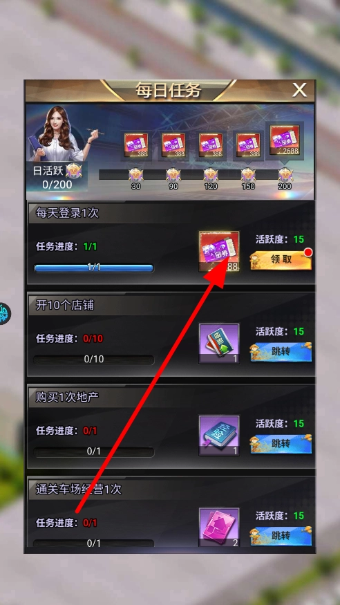 1. 在每日任务界面,设有各类任务,诸如每日登录、开设店铺、购置地产等。完成这些任务后,可获取活跃度以及相应奖励,从而为经营发展提供助力。