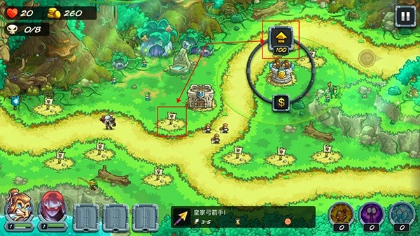 2、操控防御塔旁的士兵以及两位英雄,以此抵御敌人来袭。借助英雄技能展开战斗,成功击退你的敌人。