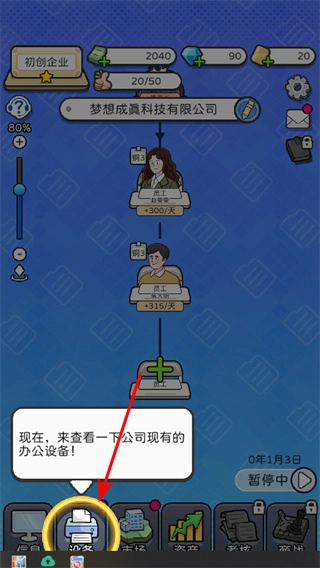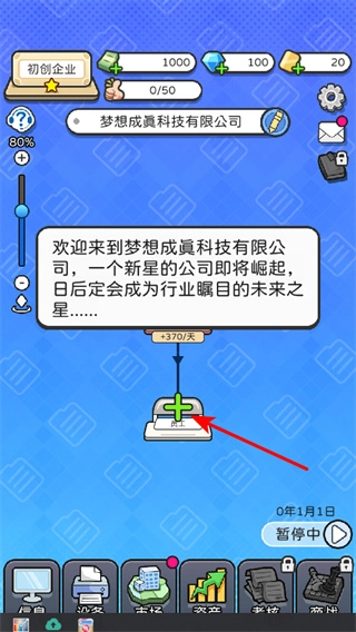 1. 轻点位于中间位置的绿色加号按钮,即可开启公司的基础业务,每天能获取像 +270 这样的初始收益,这是公司发展的首要步骤。为积累资金,需持续进行此项操作。