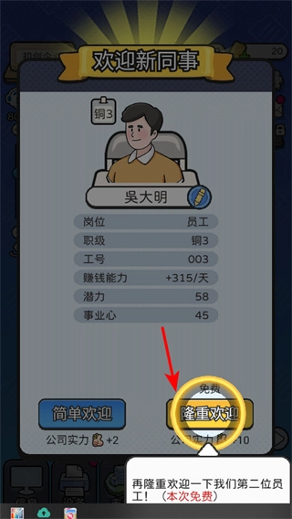 3、若吴大明决定采用隆重欢迎的方式,这不仅能够提升公司实力,还能提高员工满意度。此次欢迎活动免费进行,但需要积极组织开展员工欢迎仪式,以此增强团队的凝聚力。