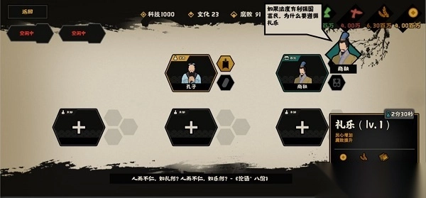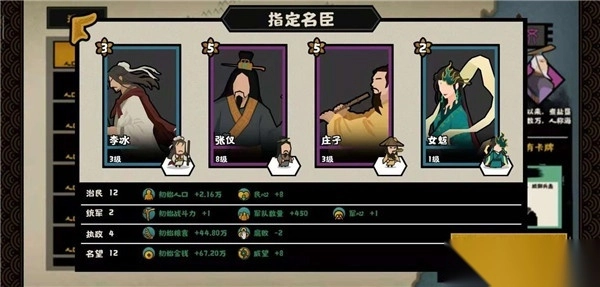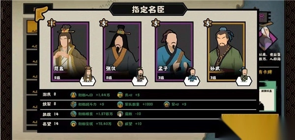 这套阵容选用的几位名臣获取门槛都不高,组合起来却能发挥出远超投入的效果。其中三位角色的技能都和民心系统深度绑定——既能提升民心数值,自身效果又依赖高民心带来的增益;同时这三者里还有两位能强化军事层面的表现,而且整套配置没有明显的负面效果。另外那位则是春秋时期的核心选择,凭借独特的技能机制,能让玩家在前期阶段拥有更灵活的策略空间,无论是专注发育还是主动出击都更有余地。