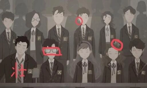 从日记里找出同学的代号,再对照照片里人物的特征,把代号填到对应的位置上。