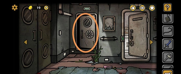 我们返回最初所在的房间,点击大门,用钳子剪断连接处,出门后在左侧门的下方拿到铁丝。