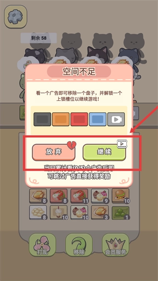 4、当出现“空间不足”的弹窗提示时,您可以选择点击【继续】按钮,通过观看广告来解锁槽位;也可以选择点击【放弃】按钮,以此结束当前的游戏进程。