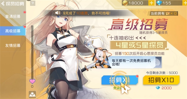 6.要是觉得探员不够给力,想换阵容的话,那就继续招募新探员吧!目前有四种招募方式,分别是普通招募、高级招募、特异招募和友情招募,其中高级招募和特异招募有很大概率能抽到五星探员哦!前期建议先培养一些比较常见的探员,等过了主线之后,再考虑更换阵容。