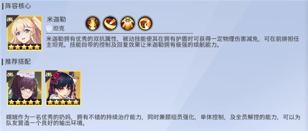 米迦勒拥有优秀的双抗属性被动技能使其在拥有护盾时可获得一定物理伤害减免,可在前排担任主坦克。技能自带的控制及回复效果让米迦勒拥有极强的续航能力。