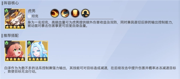 身为一名坦克,高额血量可为虎男提供额外伤害收益及双防,同时兼具直切后排的输出控制能力,被动面对暴击伤害时更可回复自身血量。