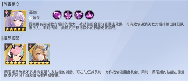 聂隐拥有突袭敌方后排的能力,被动首回合百分百暴击效果,可有效快速消灭敌方后排输出降低队伍压力。面对法师,聂隐更将获得额外的技能伤害加成。