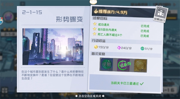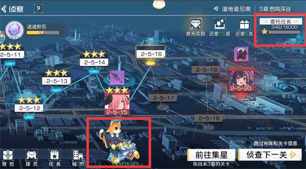 4.记得处理委托任务,派遣探员完成对应任务就能领取奖励,每次派遣会消耗委托积分,而委托积分可通过恶猫行动(也就是侦察挂机)随时间积累。在恶猫行动里,通关更高关卡能加快收益获取速度,你还能使用快速行动功能,直接拿到120分钟的挂机奖励。