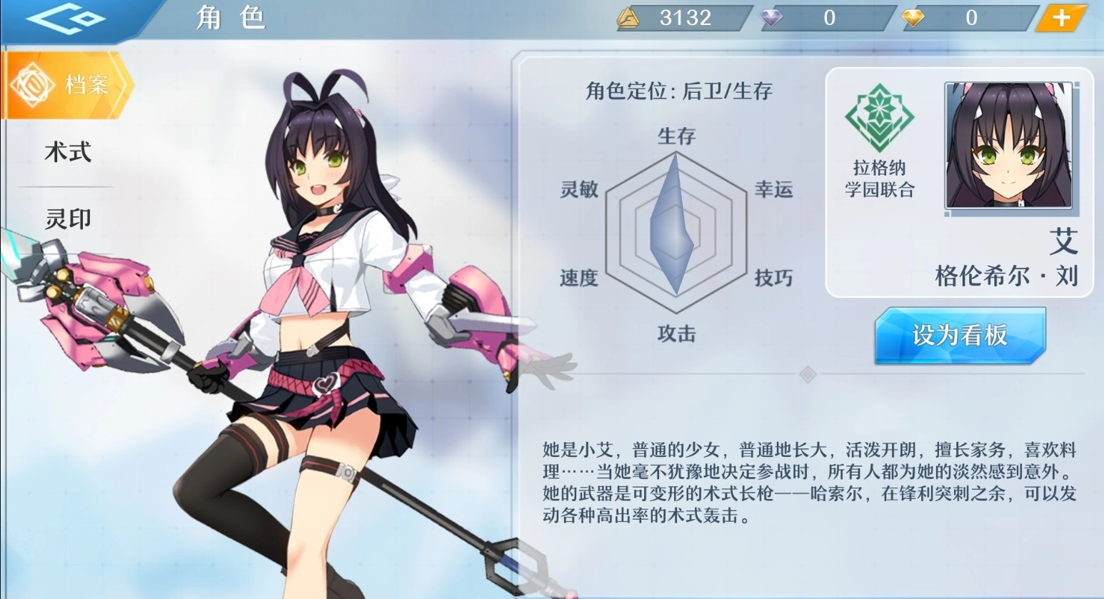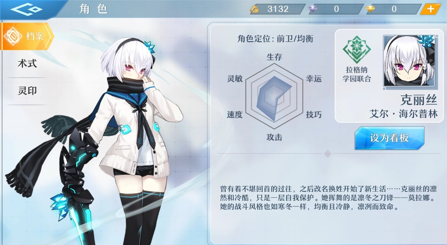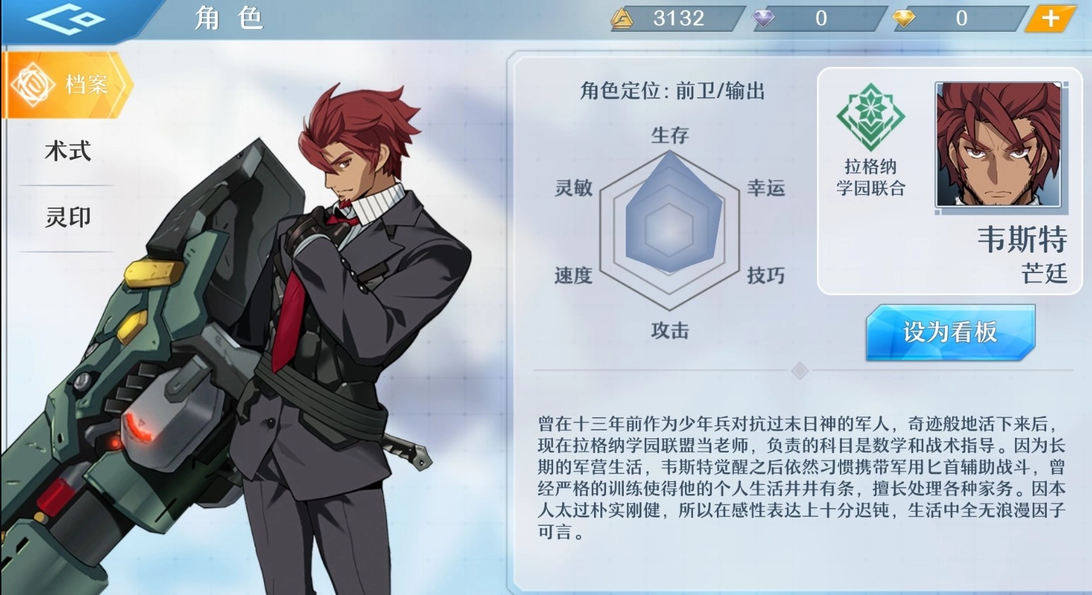 年少时曾以士兵身份投身对抗末日神的战斗,他是那场残酷战役中为数不多的幸存者。如今,他在拉格纳学园联盟里身兼两职,既是教授数学的老师,也负责战术指导工作。战斗时,他总习惯用一把军用匕首来辅助自己;而在生活里,严格的训练让他始终保持着规律有序的状态,唯独在情感表达方面,他显得有些木讷笨拙。