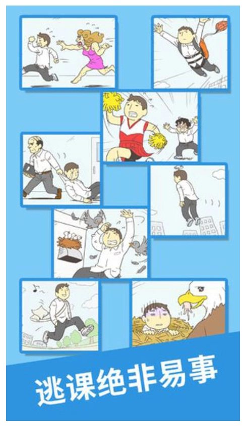 你需要协助主角达成翘课目标,过程中得留意别被那位发型独特的老师逮到。游戏里的每个关卡场景都不一样,你得仔细观察周围环境和可用物品,这样才能更顺利地通关。