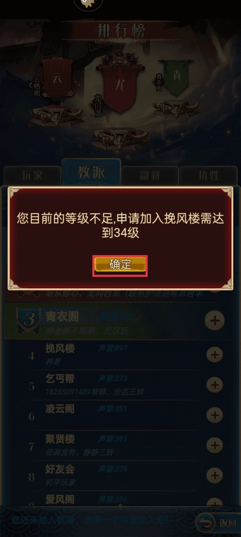 3、需要注意的是,只有当你的等级达到34级,才拥有申请加入教派的权限。